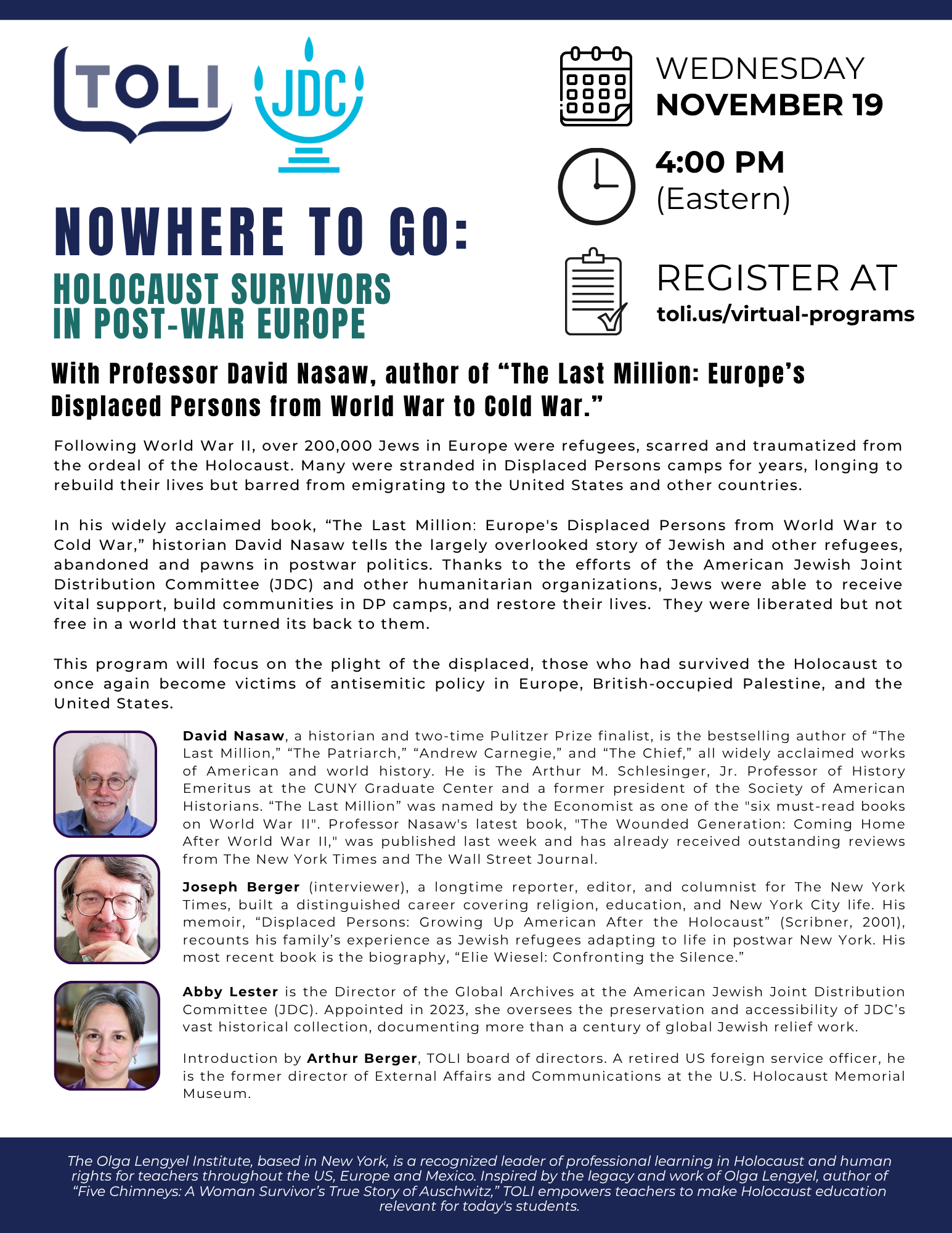 TOLI presents live and virtual programs, featuring scholars, writers, journalists, and other professionals on topics relating to our mission of Holocaust education, human rights education, countering antisemitism and racism, and strengthening democracy and pluralism. They’re free and open to the public. View all Recorded Programs here.