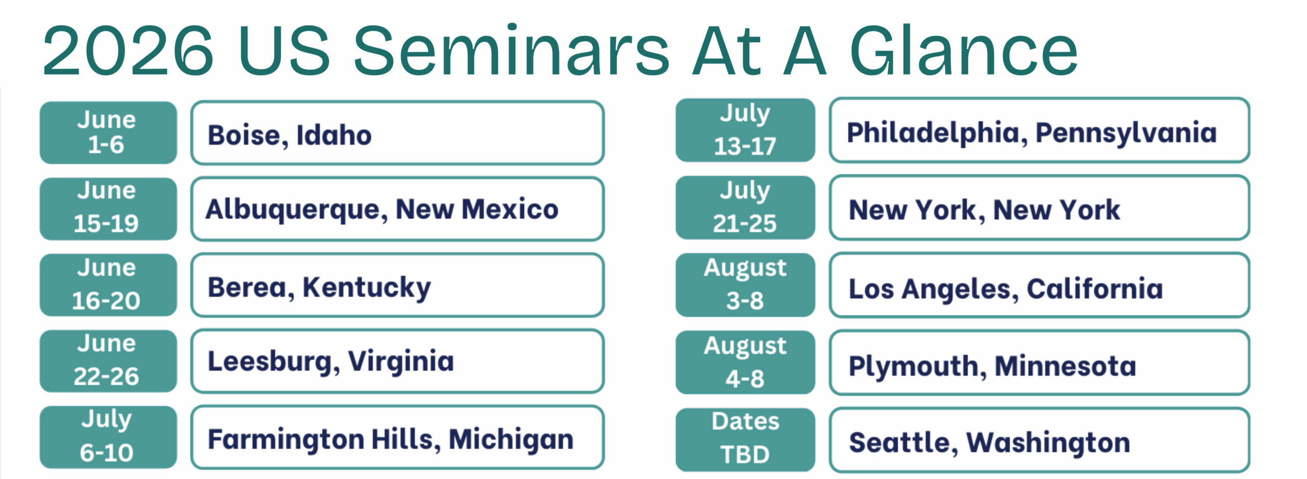 Our 2026 US Seminars will take place in Idaho, New Mexico, Kentucky, Virginia, Michigan, Pennsylvania, New York, California, Minnesota, Washington, and Florida. Applications are now being accepted! Read More and Apply.