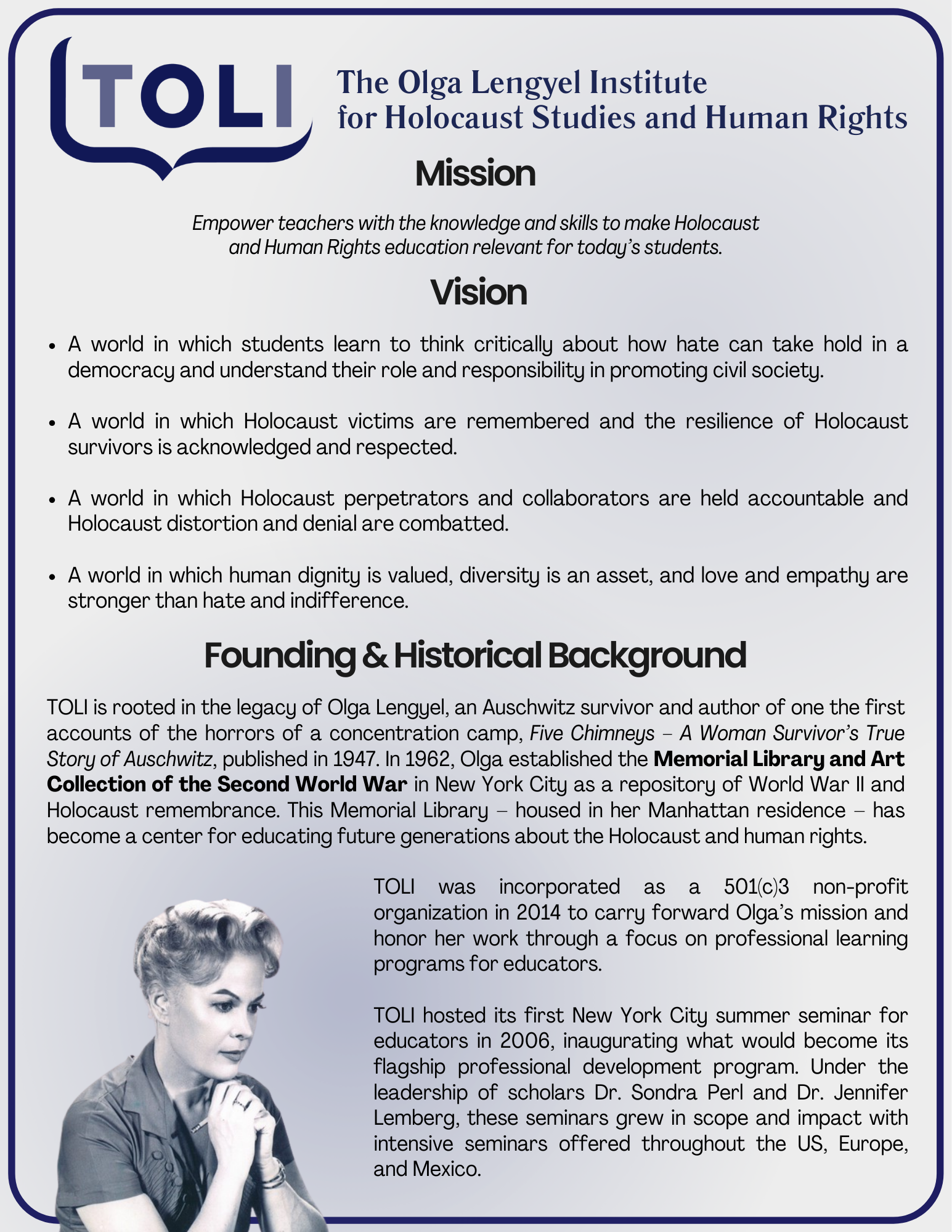 The Olga Lengyel Institute is a recognized leader of Holocaust and human rights professional development education for teachers throughout the US and Europe. Inspired by the legacy of Olga Lengyel, author of Five Chimneys: A Woman Survivor’s True Story of Auschwitz, TOLI provides educators with the knowledge, skills and confidence to make the Holocaust relevant for today’s students.
