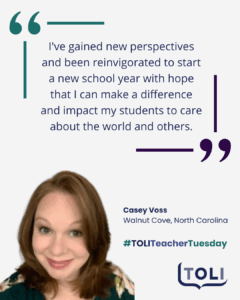 Casey Voss attended our Virginia seminar to learn how to discuss sensitive historical topics in her classroom. “By attending this seminar, my own learning [was] broadened, allowing me to bring back historical context and real-life stories to teach my students the importance of human and civil rights, as well as social justice,” Casey said. “My goal is to facilitate an increase in [students’] awareness of community, as well as empathy for diverse groups.”